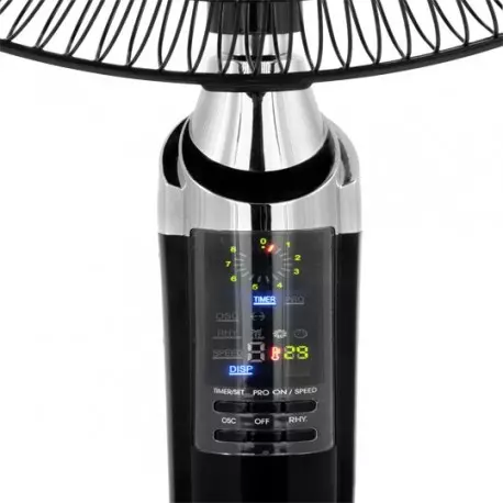 توان مصرفی: كم مصرف با توان حداكثر 60 وات، 220 ولت متناوب، 50 هرتز، حجم بادهی: داراي حجم باددهي بالا به ميزان 56 مترمكعب بر دقيقه، سایر مشخصات: داراي 6 دور متفاوت پروانه (از 550 تا 1200 RPM)، داراي پدال جهت تغيير سرعت يا روشن و خاموش كردن محصول، قابليت برنامه ريزي در زمان خاموش بودن پنكه جهت روشن شدن آن و استفاده از پنكه در زمانهاي مختلف دلخواه، داراي نمايشگر ديجيتالي دما (دماسنج)، داراي صفحه نمايشگر زيبا براي نمايش كليه ويژگيها، داراي رنگ تركيبي مشكي و آبكاري، مجهز به كنترل از راه دور، داراي تايمر 8 ساعته با فواصل زماني 0.5 ساعته، داراي گارد محافظ ايمن طرح ميله اي، داراي موتور مجهز به فيوز حرارتي، داراي قابليت تنظيم آسان زاويه وزش باد به صورت جغجغه اي، قابليت تنظيم گردش افقي قابل كنترل از راه دور، مجهز به حالت ريتم جهت دستيابي به وزش باد ملايم، داراي پايه زيباي پلاستيكي، داراي سيم دوشاخه سه متري با روكش پي وي سي، داراي گواهينامه استاندارد ايمني محصول، داراي لوله استيل و قابليت تنظيم ارتفاع، داراي پايه نگهدارنده ريموت كنترل بر روي بدنه اصلي، داراي 2 ماه وارانتي ،25 ماه گارانتي، 10 سال تامين قطعات و خدمات پس از فروش
