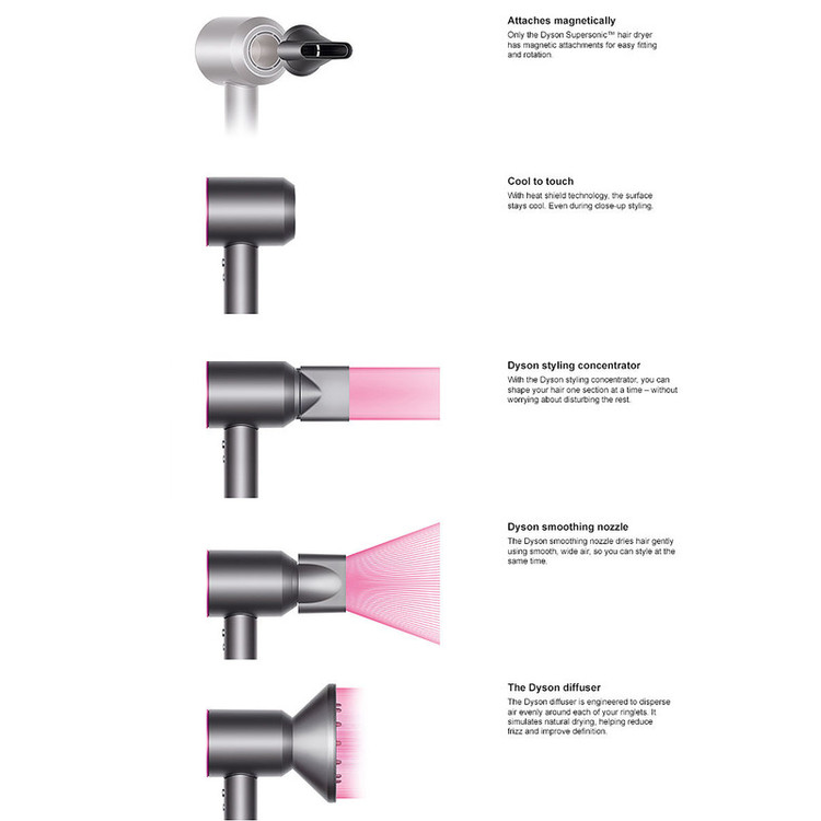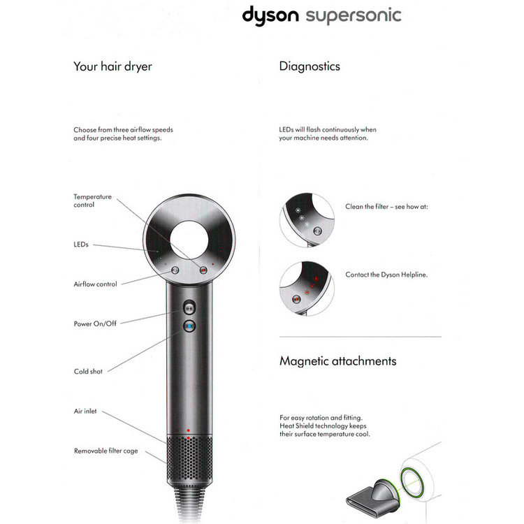 سشوار فوق حرفه ای دایسون سوپر سونیک به عنوان یک سشوار کاملا حرفه ای و با داشتن موتور بسیار قوی که 9v توان دارد و فن آن دارای 13 پره میباشد . طراحی بسیار لوکس و ساده ای دارد که در طراحی آن اصول مهندسی کاملا رعایت شده است ، این سشوار با وجود اینکه قدرت بسیار زیادی دارد اما وزن آن بسیار کم میباشد و هنگام کار با آن هیچگونه احساس خستگی نمیکنید همچنین این سشوار 10000 بار در دقیقه چرخش دارد. در ساخت این محصول از آخرین تکنولوژی روز دنیا استفاده گردیده است به عنوان مثال در قسمت داخلی عناصر گرمایشی قرار داده است و ایمنی را بالا تر برده است.