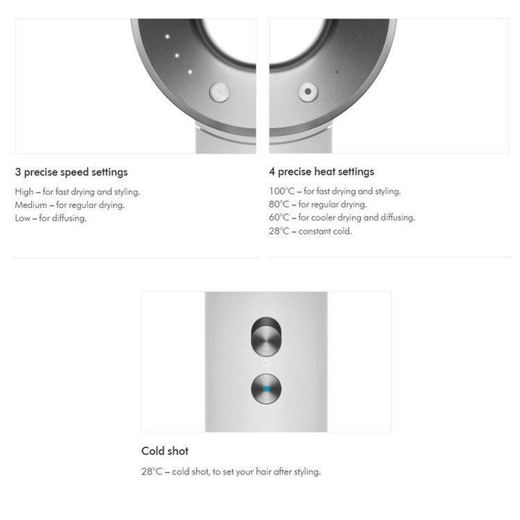 سرعت خشک کردن موها با این سشوار فوق العاده بالاست. علاوه بر خشک کردن موها می توان برای حالت دهی موها نیز از این سشوار استفاده نمود. خشک کردن و حالت دهی بدون استفاده از حرارت از ویژگی هایی است که در این سشوار وجود دارد. ماده خاصی از این سشوار خارج شده و وارد حفرههای خاصی میشود که داخل محصول تعبیه شدهاند. هر یک از این حفرهها کارایی جداگانهای دارند. مثلا یکی برای مواج کردن موها و دیگری برای لَخت کردن آن است. در حال حاضر مالکیت معنوی این طرح به نام کمپانی دایسون در بریتانیا ثبت شده است.