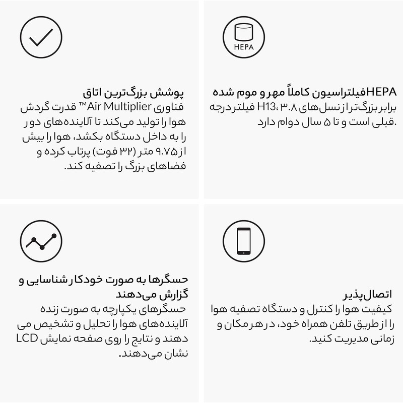 سایر مشخصات : انواع سیستم های کنترل: - کنترل از راه دور - کنترل از روی صحه نمایش LCD روی دستگاه - از طریق برنامه موبایل MyDyson - کنترل از طریق صوتی با کمک هوش های مصنوعی Amazon Alexa / Apple Siri / Google Assist /