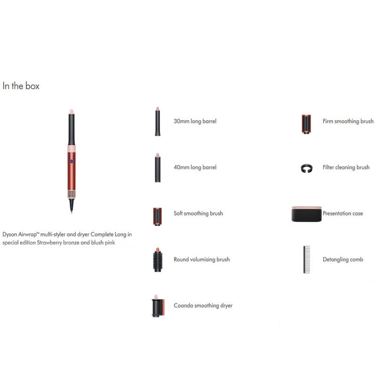 سشوار و فر کننده مو دایسون مدل Dyson Airwrap یکی از قدرتمند ترین سشوار های موجود در دنیا می باشد که طراحی بسیار زیبا و دارای بدنه ای با کیفیت است . شرکت دایسون که از پرچمداران و بهترین ها و قدیمی ترین کمپانی های ساخت لوازم برقی انگلستانی است چند سالی است با خاص تر کردن طراحی های خود مجدد به چشم طرفداران این کمپانی آمده است.دایسون با تولید سشوارهای جذاب که علاوه بر کیفیت ، ظاهری شیک و خاص نیز دارند در بین خانم ها بسیار مشهور شده است . در طراحی سشوارهای این کمپانی که عمدتا به حفظ سلامت موها بیشتر از کمپانی های دیگر فکر شده است ، شرکت به شما وعده داده تا موهایتان با استفاده از این دستگاه ها به هیچ وجه آسیب نبینند و خشک و شکننده نیز نشوند . سشوار و فر کننده دایسون Dyson Airwrap Multi Styler Complete Long مدلی کامل و فوق العاده است و یکی از کاملترین سشوارهای این کمپانی به حساب می آید . شما با کمک این دستگاه میتوانید استایل موهای خود را تغییر دهید و آن ها را به زیباترین شکل ممکن آرایش کنید . سشوار برس دار دایسون Dyson Airwrap Multi Styler Complete Long دارای 6 سری متفاوت است که هر کدام به موهای شما حالتی جدید می بخشد . شما با این 6 سری متنوع میتوانید موها را خشک کنید ، فر کنید ، حالت دار کنید و یا به لخت ترین شکل ممکن در بیاورید . نگران نگهداری این سری ها نباشید چرا که این کمپانی به این موضوع نیز فکر کرده است و یک کیس سورمه ای زیبا برای آن ها تعبیه شده که شما میتوانید دستگاه و سری ها را در آن نگه دارید . در کنار تمام این قابلیت ها این دستگاه نیز قابلیت یون سازی دارد و به سلامت بیشتر موهای شما کمک می کند . فناوری هوشمند پروانه 13 پره تا 110000 دور در دقیقه می چرخد و 3.2 کیلو پاسکال فشار تولید می کند و آنقدری قدرتمند است که بتواند اثر کوآندا را ایجاد کند. علاوه بر این، کنترل هوشمند حرارتی دمای جریان هوا را بیش از 40 بار در ثانیه اندازه گیری می کند تا دما را در سطح بهینه نگه دارد . استفاده از اثر کواندا Dyson Airwap Multi Styler Complete Long با بهره مندی از موتور قدرتمند V9 می تواند یک پدیده آیرو دینامیکی به نام اثر کواندا را ایجاد کند و از هوا برای جذب و پیچش موها روی سطح حالت دهنده یا برس استفاده می کند، بدون اینکه نیار به حرارت بالایی داشته باشد .