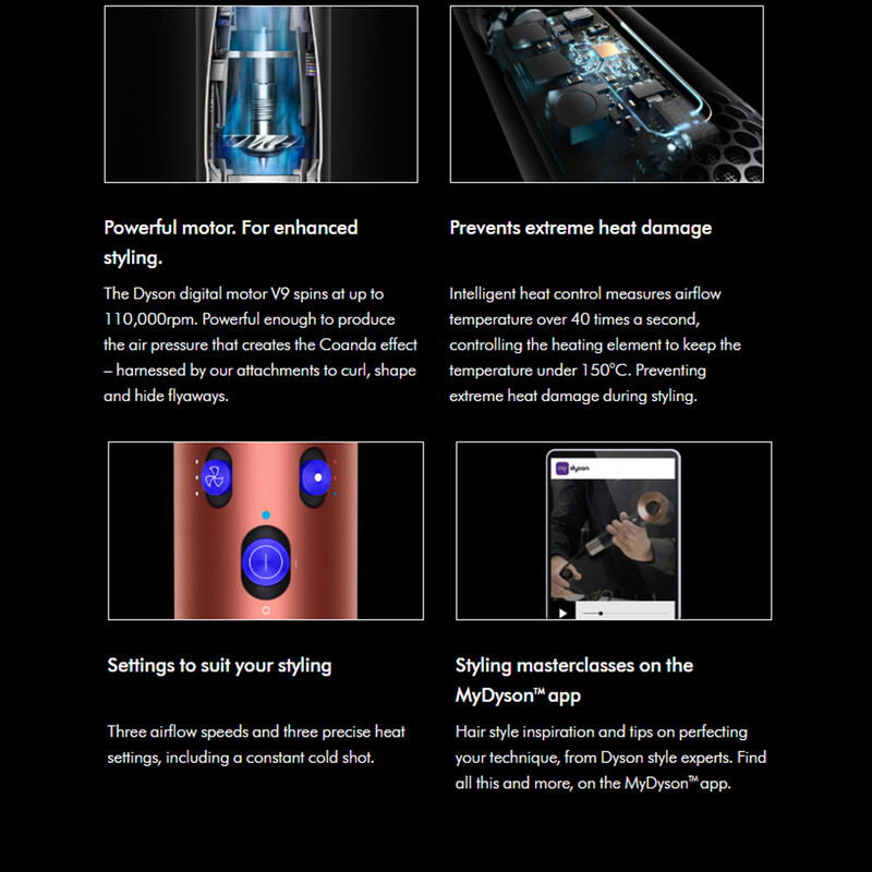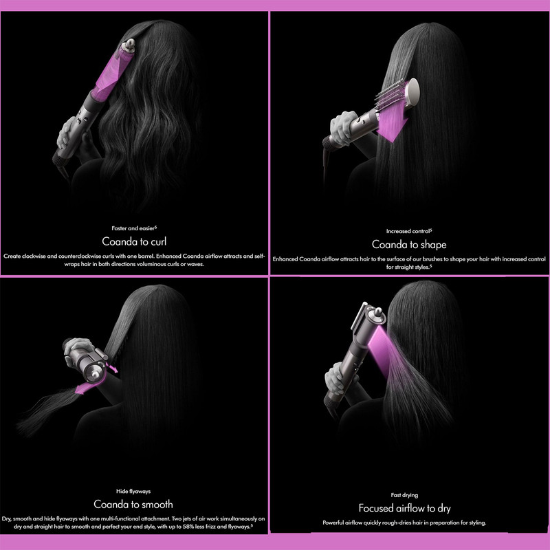 سشوار و فر کننده مو دایسون مدل Dyson Airwrap یکی از قدرتمند ترین سشوار های موجود در دنیا می باشد که طراحی بسیار زیبا و دارای بدنه ای با کیفیت است . شرکت دایسون که از پرچمداران و بهترین ها و قدیمی ترین کمپانی های ساخت لوازم برقی انگلستانی است چند سالی است با خاص تر کردن طراحی های خود مجدد به چشم طرفداران این کمپانی آمده است.دایسون با تولید سشوارهای جذاب که علاوه بر کیفیت ، ظاهری شیک و خاص نیز دارند در بین خانم ها بسیار مشهور شده است . در طراحی سشوارهای این کمپانی که عمدتا به حفظ سلامت موها بیشتر از کمپانی های دیگر فکر شده است ، شرکت به شما وعده داده تا موهایتان با استفاده از این دستگاه ها به هیچ وجه آسیب نبینند و خشک و شکننده نیز نشوند . سشوار و فر کننده دایسون Dyson Airwrap Multi Styler Complete Long مدلی کامل و فوق العاده است و یکی از کاملترین سشوارهای این کمپانی به حساب می آید . شما با کمک این دستگاه میتوانید استایل موهای خود را تغییر دهید و آن ها را به زیباترین شکل ممکن آرایش کنید . سشوار برس دار دایسون Dyson Airwrap Multi Styler Complete Long دارای 6 سری متفاوت است که هر کدام به موهای شما حالتی جدید می بخشد . شما با این 6 سری متنوع میتوانید موها را خشک کنید ، فر کنید ، حالت دار کنید و یا به لخت ترین شکل ممکن در بیاورید . نگران نگهداری این سری ها نباشید چرا که این کمپانی به این موضوع نیز فکر کرده است و یک کیس سورمه ای زیبا برای آن ها تعبیه شده که شما میتوانید دستگاه و سری ها را در آن نگه دارید . در کنار تمام این قابلیت ها این دستگاه نیز قابلیت یون سازی دارد و به سلامت بیشتر موهای شما کمک می کند . فناوری هوشمند پروانه 13 پره تا 110000 دور در دقیقه می چرخد و 3.2 کیلو پاسکال فشار تولید می کند و آنقدری قدرتمند است که بتواند اثر کوآندا را ایجاد کند. علاوه بر این، کنترل هوشمند حرارتی دمای جریان هوا را بیش از 40 بار در ثانیه اندازه گیری می کند تا دما را در سطح بهینه نگه دارد . استفاده از اثر کواندا Dyson Airwap Multi Styler Complete Long با بهره مندی از موتور قدرتمند V9 می تواند یک پدیده آیرو دینامیکی به نام اثر کواندا را ایجاد کند و از هوا برای جذب و پیچش موها روی سطح حالت دهنده یا برس استفاده می کند، بدون اینکه نیار به حرارت بالایی داشته باشد .