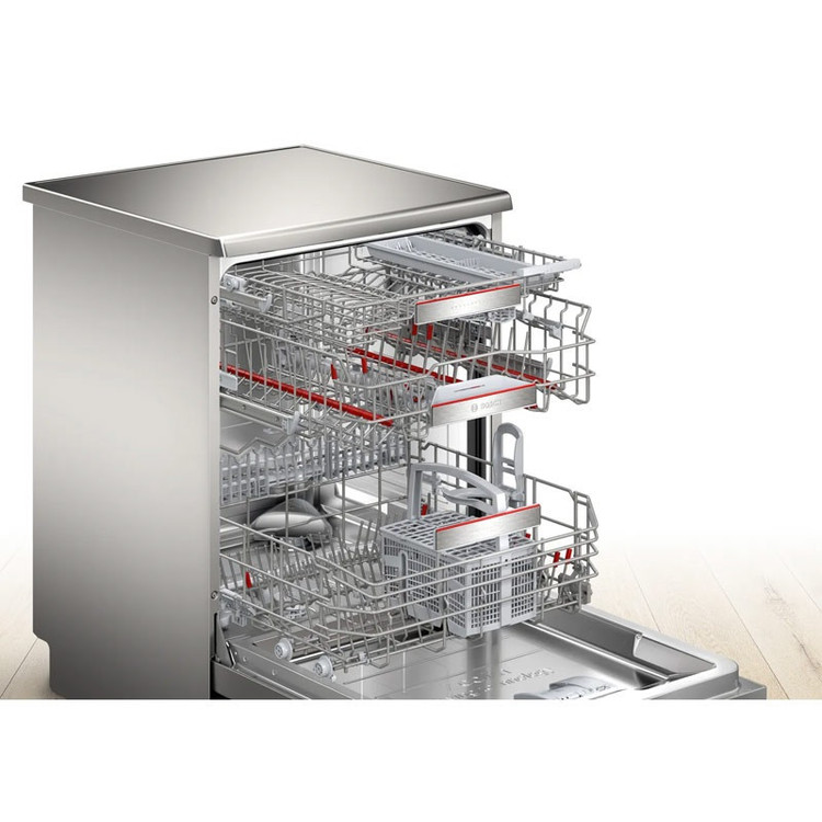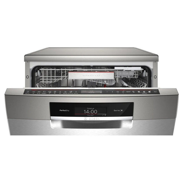 ظرفشویی بوش BOSCH مدل SMS8ZDI86 با رده انرژی +++A جزء سری 8 لباسشویی های بوش بوده که دارای ظرفیت 14 نفره میباشد و حجم زیادی از ظروف را در هر بار استفاده شستشو میدهد. پنل این ظرفشویی شامل 8 برنامه شستشو و 5 برنامه ویژه است. برنامه های شستشو شامل شستشوی قوی، شستشوی اتوماتیک، شستشوی اقتصادی، شستشوی آرام یا شبانه، شستشوی ظروف شیشه ای ، شستشوی سریع و پیش شستشو می باشند. برنامه های ویژه نیز شامل خشک کن اضافی، شستشو با نصف ظرفیت، شستشوی Hygiene Plus ، قابلیت تنظیم از راه دور HOME CONNECT ، برنامه جرم گیر و Vario Speed Plus vh را دارد.ویژگی منحصر به فرد ظرفشویی 8zdi86 قابلیت استفاده با نصف ظرفیت است تا باعث کاهش مصرف آب و برق بدلیل ظروف کمتر از ظرفیت ظرفشویی شود. با فعال نمودن ویژگی Hygiene plus ظروف با دمای بالاتری شسته شده و موجب از بین رفتن باکتری ها میشود. vario speed plus نیز حجم زیادی از ظروف را تا 3 برابر سریع تر از سایر برنامه ها شستشو داده و خشک می نماید. 3 سبد برای قرار گیری ظروف ارائه شده که از سبد پلاستیکی برای قاشق و چنگال و از دو سبد استیل ضد زنگ با قابلیت تنظیم ارتفاع برای قرار گیری ظروف و قابلمه استفاده میشود. فناوری Active water استفاده شده در این ظرفشویی علاوه بر مصرف کمتر آب و انرژی حین شستشو، موجب گردش هدفمند آب، بهبود عملکرد پمپ و گرمایش سریع آب میشود. سنسور load sensor وزن ظروف را اندازه گیری نموده و با توجه به وزن، آب مصرف می نماید. ظرفشویی BOSCH قابلیت شروع با تاخیر داشته که میتوانید از 1 تا 24 ساعت برنامه شستشو را به تعویق بیندازید. توسط این ویژگی میتوانید در زمان دلخواه حتی هنگامی که در منزل نیستید ماشین ظرفشویی را روشن نمایید. توسط سیستم ضد نشت، در صورت نشت آب از ظرفشویی آب به صورت اتوماتیک قطع میشود. قفل کودک تعبیه شده روی این ظروفشویی از باز شدن درب حین کار جلوگیری می نماید.سیستم خشک کن Zeolith: عملکرد خشک کنندگی بدون نقص با استفاده از جریان هوای یکنواخت در سه جهت، حتی برای ظروف پلاستیکی میباشد .