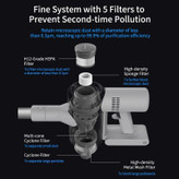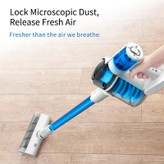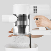 بر روی قسمت بالایی دسته جارو، باتری و محفظه آشغال جای گرفته است. این محفظه تنها 0.5 لیتر گنجایش داشته که برای یک بار کامل جارو زدن یک آپارتمان متوسط کافی است. اما به هر حال پس از هر استفاده باید خالی و تمیز شود. بر خلاف جارو های رباتیک که فیلتر HEPA داخل خود دستگاه قرار گرفته، در این جارو این فیلتر درست بالای محفظه آشغال، در بین مسیر ورودی آشغال ها و خروجی هوا کار گذاشته شده است. این فیلتر قابل شستشو، جاذب ذرات گرد و غبار بوده و از خروج آن ها از دستگاه و ایجاد حساسیت برای افراد آلرژیک کاملاً جلوگیری میکند.