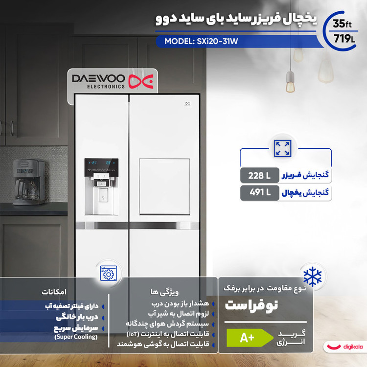 دوو SXi20-31W با کمپرسور اینورتر دیجیتال و ردهی انرژی A+، یک شاهکار هوشمند و جادار است که تجربهی نگهداری مواد غذایی را برای خانوادههای ایرانی متحول میکند.